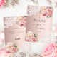 Um cartões de agradecimentos moderno e elegante de batismo/batismo batizante. Um fundo de gradiente rosa ouro. Decorados com ouro rosa e rosas rosa-pinceladas, flores florais, rendas brancas e uma cruz de ouro. Na frente do texto: Obrigado. Voltar: Modelo para uma nota de agradecimento e nome.