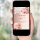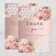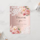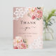 Um cartões de agradecimentos moderno e elegante. Um fundo de gradiente rosa ouro. Decorado com ouro rosa e rosas rosa-pinceladas, flores florais e rendas. Na frente do texto: Obrigado. Back: Modelo para sua nota de agradecimento e seu nome.