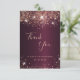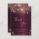 Um cartões de agradecimentos para uma Quinceañera, 15.. aniversário. Uma cor de fundo metálica de aparência grosseira e falsa. Com rosa dourado falso poeira brilhante. À frente, um texto com letras grandes e o texto: Obrigado, seu texto, título e uma data. Back: Modelo para sua nota de agradecimento e seu nome.