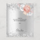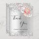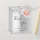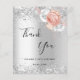 Um cartões de agradecimentos para um aniversário de 50 anos (ou qualquer idade). Um fundo de olhar mal prateado. Decorados com ouro rosa e flores brancas, flores e brilho falso, faíscas. À frente, um grande texto escrito à mão e o texto: Obrigado, seu texto, título e uma data. Voltar: personalize e adicione seu nome e nota de agradecimento.