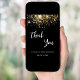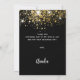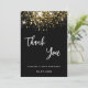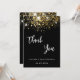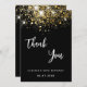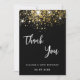 Um fundo preto, brilho de ouro falso decorado, brilhos. Na frente, o texto escrito em letras grandes e o texto: Obrigado. Voltar: Personalize e adicione sua nota de agradecimento e seu nome. O nome é escrito com um moderno estilo escrito à mão. Texto branco.