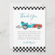 Cartões de agradecimentos com tema de corrida moderno com chá de fraldas com ilustração aquosa de um carro vintage azul com chamas vermelhas. A mensagem obrigado hóspedes por vir ao chá e pelos presentes. Perfeito para o chá de um bebê.
