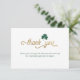 Este cartão de nota de agradecimento elegante e elegante apresenta um trevo verde de quatro folhas (shamrock) acima das palavras "Obrigado" em uma fonte de script dourada (folha simulada). O fundo é branco, mas pode ser alterado para qualquer cor de sua escolha. A parte de trás do cartão está verde e também pode ser alterada para qualquer cor de sua escolha.