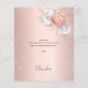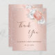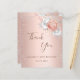 Um cartões de agradecimentos para um aniversário de 50 anos (ou qualquer idade). Um fundo rosa dourado, gradiente de cinza. Decorado com ouro rosa e florais brancos e brilho prateado falso, brilhos. À frente, um grande texto escrito à mão e o texto: Obrigado, seu texto, título e uma data. Voltar: personalize e adicione seu nome e nota de agradecimento.