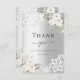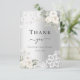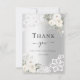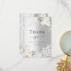 Um cartões de agradecimentos moderno e elegante. Um fundo de olhar mal prateado. Decorado com rosas brancas, flores florais e rendas. Na frente do texto: Back: Modelo para sua nota de agradecimento e nome.