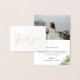 Cartões de agradecimentos de fotos de casamento de folha de ouro elegante. Dentro de cartão apresenta arranjos florais de ilhas de cor botânica aquática em tons de pêssego, coral, pincel e verde. Personalizar texto, personalizar estilo e tamanho da fonte.