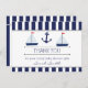 Os cartões de agradecimentos lisos náuticos do chá de fraldas deste menino caracterizam dois barcos de vela bonitos, uma âncora, e a corda. O design igualmente inclui dois divisores pretos e quatro estrelas pequenas. A área de texto é branca e a parte superior e a base são brancas e um teste padrão listrado dos azuis marinhos. A parte traseira do cartão caracteriza o teste padrão listrado do azul marinho e o branco e uma corda. O mesmo convite do chá de fraldas do design está disponível na loja. Os cartões de agradecimentos lisos do chá de fraldas náutico deste menino estão prontos para ser personalizado.