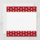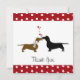 Dachshunds marrons e pretos doces que compartilham de um smooch, com os corações entre eles, contra um fundo branco. Beira vermelha e branca das bolinhas, na parte superior e na parte inferior do cartão. Obrigado no texto preto do roteiro, sob os cães. A mesma beira das bolinhas, na parte traseira do cartão, com espaço vazio para seu próprio texto.