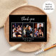 Adicione 3 das suas fotos de aniversário, tamanho vertical, uma data, nome e a nota de agradecimento. Um fundo preto clássico com texto branco e quadro. O texto: Obrigado na frente e seu nome no verso é escrito com um script com na moda.
