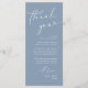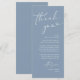 Torne a sua recepção de casamento especial com este cartões de agradecimentos de casamento elegante, projetado para ser colocado na configuração de janto de cada convidado. Apresentando um layout moderno minimalista com letra chic script, tema azul empoeirado, é uma maneira séria de expressar gratidão à família e amigos por compartilhar seu grande dia. Perfeito para jantas de casamento, jantadas de ensaio ou recepções, este cartão personalizável pode ser personalizado com os seus nomes, data e mensagem especial. Um detalhe de na moda que dobra como decoração de mesa de casamento, dando aos hóspedes uma grande atenção para se lembrarem da noite. Ideal para temas de casamento modernos, rústicos ou clássicos.
