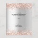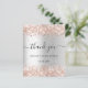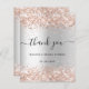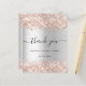 Um cartões de agradecimentos para um Chá de panela. Um fundo metálico falso prateado. Com rosa dourado falso poeira brilhante. Na frente, o texto com letras grandes e o texto: Obrigado, seu texto, título e uma data. Voltar: Personalize e adicione seu nome e nota de agradecimento.