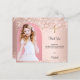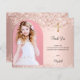 Um cartões de agradecimentos de confirmação moderno e elegante. Um fundo rosa dourado decorado com confete e uma cruz ouro. Personalize e adicione sua foto, obrigado nota e nome. Fotografia do arco.