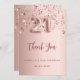 Um cartões de agradecimentos para um aniversário de 21 anos. Uma cor de fundo rosa dourada. Com rosa dourado pingando estrelas brilhantes. Na frente: número 21 escrito com uma fonte no estilo do balão, um grande script com letra rosa dourada escura e o texto: Obrigado, seu texto, título e uma data. Voltar: Personalize e adicione seu nome e nota de agradecimento.
