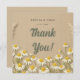 Um cartões de agradecimentos de casamento rústico, projetado para complementar o convite de camomila correspondente. Colocada sobre um fundo em papel kraft, apresenta delicadas flores de camomila desenhadas à mão em marfim e amarelo pálido, acentuadas com grama macia de pampas e sutil textura de linho para uma sensação quente e sutil.