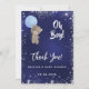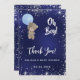 Um fundo azul marinho. A cor azul é irregular. Um ursinho de pelúcia segurando um balão azul e uma brilhante prata falsa. Personalize e adicione nome(s) e uma data na frente. O nome e o texto: Oh Boy! são escritos com um estilo escrito manualmente Back: Obrigado nota e nome(s)
