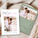 Envie uma mensagem calorosa e elegante de obrigados com este Cartões de agradecimentos de Casamento Fotográfico de Sage Green Script. Apresentando um fundo verde macio, uma tipografia graciosa com script e um espaço para sua foto favorita de casamento, esta design é perfeita para os temas de casamento inspirados na natureza, rústicos ou minimalistas. Personalize-o com os seus nomes e uma nota sincera para criar uma manutenção significativa que reflita a beleza e gratidão do seu dia especial.
