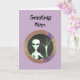 Uma alienígena oferece cartões de aniversários da porta de uma nave espacial.