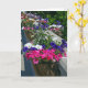 Cartão do feliz aniversario. Fotografia das cestas da flor que penduram em uma ponte em Leland, Michigan. Vários petúnias coloridos em branco, em cor-de-rosa, e violeta. Estúdios de Shoaff Ballanger do © da imagem e do verso/2015.