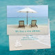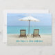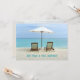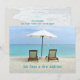 Cartões de anúncio de novo endereço de cadeiras de praia. Personalize o texto na frente e no verso. Cadeiras na areia sob um guarda-sol com uma vista para um mar turquesa, é a imagem na frente. Inclua a nova informação de endereço no verso sobre uma cena de praia que inclui uma grande concha. Perfeito para aqueles que se aposentam ou se mudam para o paraíso!