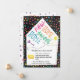 Cartões de convite móveis com uma pequena casa divertida e esquisita com o novo dentro de detalhes de endereço e com a letra de "New Home Sweet Home" em cima com uma chave e um balão. Na parte de trás está uma ilustração bonita de padrão preto e branco de uma bicicleta, carro, chave, balão de ar e texto "Nós nos movemos!". Tudo em cores divertidas do arco-íris perfeitas para famílias com crianças!