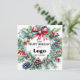 Cartões personalizados de "Boas Festas" para clientes ou funcionários, personalizados com o logotipo da sua empresa, o ano, uma grande coroa floral festiva, um laço vermelho elegante e um padrão de flocos de neve azuis no verso. Suprimentos promocionais da empresa para o Natal.