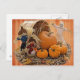 O cartão postal da colheita apresenta uma cesta de feno com abóboras e folhas com duas espantagens bonitinhas e um fantasma. Saudações perfeitas para a próxima temporada de outono.