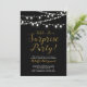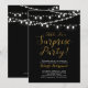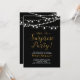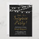 Celebre um dia especial com este convite de festa surpresa em dourado! Este design apresenta uma tipografia de roteiro elegante com uma textura de brilho dourado e cordão de luz em um fundo preto. Você pode personalizar a cor do fundo.