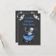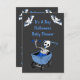 Um cartão original do convite do chá de fraldas do Dia das Bruxas que oferecesse um esqueleto pequeno do bebé que se senta acima em uma luz - pram azul, coberto por uma cobertura azul e agitando um osso deu forma ao chocalho de esqueleto como a imagem central no cartão do convite. A parte superior do cartão mostra dois bastões azuis pequenos que batem feliz ao redor em ambos os lados do fraseio. A parte traseira do é um chá de fraldas que do Dia das Bruxas do menino o cartão vem com detalhes completos da informação do partido junto com as mesmas imagens adoráveis do bastão dos azuis bebés que se sentam à direita superior e média do cartão. Todo o fraseio pode ser personalizado com seus próprios detalhes do partido de chá de fraldas do Dia das Bruxas.