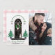 Apresentando um doce cão de Boston Terrier vestindo uma gravata cor-de-rosa! Uma varanda frontal clássica decorada para as férias, com árvores de Natal com estrelas flanqueando a elegante porta preta, uma coroa pinheira com arco de gingham rosa, e lanternas cortadas com rosas e holly. No estilo da Magolia | fazenda moderna | elegante clássico. 3 CORES DE XADREZ PARA A PARTE TRASEIRA ESTÃO NA DESIGN (cor-de-rosa como mostrado, preto ou verde escuro - basta editar e ocultar as imagens de xadrez que você não quer). Adicione o retrato da sua família para um cartões de natal pessoal!