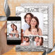 Um cartão de Natal retrógrado com suas próprias fotos enquadradas por um design de madeira rústica e seus textos personalizados. Na parte de trás está uma design bolinhas em cinza e branca.