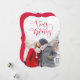 Este design apresenta um layout fotográfico de cheio e uma saudação festiva e "Muito Feliz" em vermelho. O backer vermelho inclui espaço para adicionar uma mensagem pessoal ou uma foto extra.