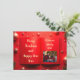 Design Elegante de Cartões de foto de Natal com fundo vermelho vibrante com ornamentos de ouro, ramificações de pinheiro festivo e uma estrutura fotográfica centralizada em um layout de livro aberto. Personalizável com seu nome de família e ano, este cartão de cartões de natal é perfeito para enviar desejos calorosos de Feliz Natal a amigos e entes queridos. Uma bela mistura de minimalismo moderno e charme de Natal eterno.