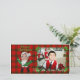 Cartões de foto de Natal Elf. Imagem e ilustração de um pequeno elfo bonitinho segurando uma faixa no fundo da xadrez com uma estrutura oca. O texto é totalmente personalizável. Adicione suas informações ou altere-as completamente. Selecione uma fonte e cor diferentes.