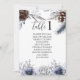 Você planeja seu casamento durante o inverno e quer ter uma mesa de presente no estilo e combinar com toda a decoração do casamento? Veja este Poster de número da mesa de casamento Floral de pinheiro de inverno. Tem um belo esquema de cor azul de inverno com elegantes florais azuis de aquarela e cones de pinho. Você pode personalizar o texto muito facilmente e até mesmo alterar o estilo e as cores da fonte se usar a ferramenta design. Tenha um belo dia de casamento, com o amor Frankie + Marlow.