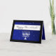 Adicione o seu nome impresso ou mensagem profissional e personalizada a este elegante cartão hanukkah contemporâneo. Design azul e branco com menorah acesa com neve branca caindo sobre um fundo azul elegante com fita branca e quadro preto. Personalize o interior com suas informações. Sem Ordem Mínima!