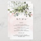 O design apresenta amostras de aquarela cor-de-rosa-claro ou pincelada com feixes simulados em ouro impressos. Design também apresenta elementos florais rosa pincelados dentro de um buquê verde ou fundo. A coroa contém um eucalipto suculento e outros elementos verdes em tons de verde escura esmeralda, verde sábio, azul empoeirado e mais para ajustado de todas as estações em que o seu casamento pode se encaixar e cores que complementam a cor.