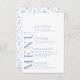 Melhore o encanto da sua celebração romântica de casamento russa com este cardápio sofisticado e polido. Com um intrincado padrão adornado com delicadas flores azuis-claras, essa bela design é elevada com personalização, mostrando os nomes da noiva e do noivo no verso. Perfeito por adicionar um toque extra de atração ao seu dia especial.
