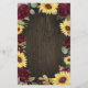 Design apresenta rosas vermelhas de cor aquosa profunda, girassóis, eucalipto e outros elementos verdes sobre fundo de grãos de madeira de celeiro rústico.
