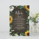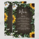 Design apresenta um fundo de madeira marrom decorado com margaridas, girassóis, verde, eucalipto, hálito de bebê e lírio do vale. Você pode usar o modelo ou adicionar mais refeições, sobremesas e muito mais. Este modelo é totalmente personalizável.