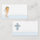 O batismo coloca cartas com o bebê anjo sobre um fundo azul de um lado e uma cruz azul de bebê no outro com uma linha para o seu nome manuscrito quando eles chegam. Basta colocar a placa na configuração do lugar da mesa.