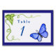 A arte apresenta uma aquarela de uma vinha verde com uma folha. Uma foto de uma borboleta azul flutuando pelo número da tabela. As palavras anotam "Mesa 1", mas podem ser personalizadas com suas próprias palavras e mensagens. Crie o seu design de cartão de mesa único, personalizando estes insetos de jardim modelos, cartões de mesa para o seu casamento, recepção ou outras informações pessoais sobre eventos.