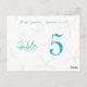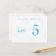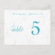 Cartões de números de mesa de água. Casamento de praia, cartões duplos com modelo para adicionar noiva e noivo, data de casamento e números de mesas. O centro é branco com números azuis.