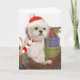 Bonito bosta branca veste chapéu vermelho de Papai Noel e cachecol enquanto está de pé no trenó cheio de presentes coloridos de Natal. Este é um cartão de Natal de Designs Friskybizpet.