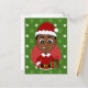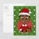 Design com ilustração de um lindo sorridente garoto afro-americano feliz com cabelo preto, o garoto está vestindo uma fantasia de Santa Cláusula com chapéu vermelho e segurando um presente; em círculo vermelho sobre fundo verde com padrão uniforme com estrelas verdes e brancas. Para ver mais de meus personagens de desenho animados, por favor visite minha loja