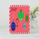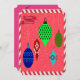Transmita seus Cartões de natal mais quentes com uma série animada de ornamentos suspensos. Cada ornamento, pendurado de uma faixa de fita vermelha festiva, exibe uma cor distinta. Um é enfeitado em verde claro com ovais verdes escuros e outro em forma oval de verde médio com listras horizontais cor-de-rosa. O terceiro vislumbre em azul escuro com pretos azuis claros, o quarto irradia em vermelho profundo com um design branco, e o quinto em azul claro com ovais cor-de-rosa com estrelas azuis claras. Juntos, eles se posicionam sobre um sumptuoso fundo vermelho, pontilhado com flocos de neve brancos e macios, cercado por uma borda doce de cana-doce.