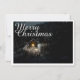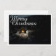A carta mostra uma cena atmosférica, enrolada, com uma pequena cabana de madeira iluminada no meio de uma floresta coberta de neve. O dentro da fonte de luz quente cria um belo contraste ao meio escuro e pacífico. A elegante inscrição "Feliz Natal" em branco dá ao motivo um toque festivo. 🎄 ✨