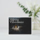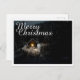 A carta mostra uma cena atmosférica, enrolada, com uma pequena cabana de madeira iluminada no meio de uma floresta coberta de neve. O dentro da fonte de luz quente cria um belo contraste ao meio escuro e pacífico. A elegante inscrição "Feliz Natal" em branco dá ao motivo um toque festivo. 🎄 ✨