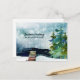 Três pinheiros estáticos ficam perto da borda do lago contra um céu aqua cheio de flocos de neve. A saudação em frente ao nosso novo cartão de endereço de feriado diz "Cartões de natal da nossa nova casa". Você pode revisar este texto assim como todo o texto na parte traseira da placa no modelo de personalização antes do check-out. Parte da nossa coleção de anúncios móveis de feriados, esta mudança de design de endereço também está disponível em uma placa simples 5 x 7 com envelope.