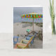 Carde características uma cena gelado da neve adiantada da estação que cai em cadeiras de praia ao lado das dunas de areia. A cena é "a angra" em Cape May, New-jersey.