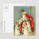 Cartões de natal de Ruas. Vintage, religiosa, imagem de Natal do Santo Nicholas dando brinquedos para crianças. Ele está vestindo um chapéu (miter), um roupão branco (cassete), uma capa vermelha, e ele está segurando um funcionarios (crosier ou crozier).